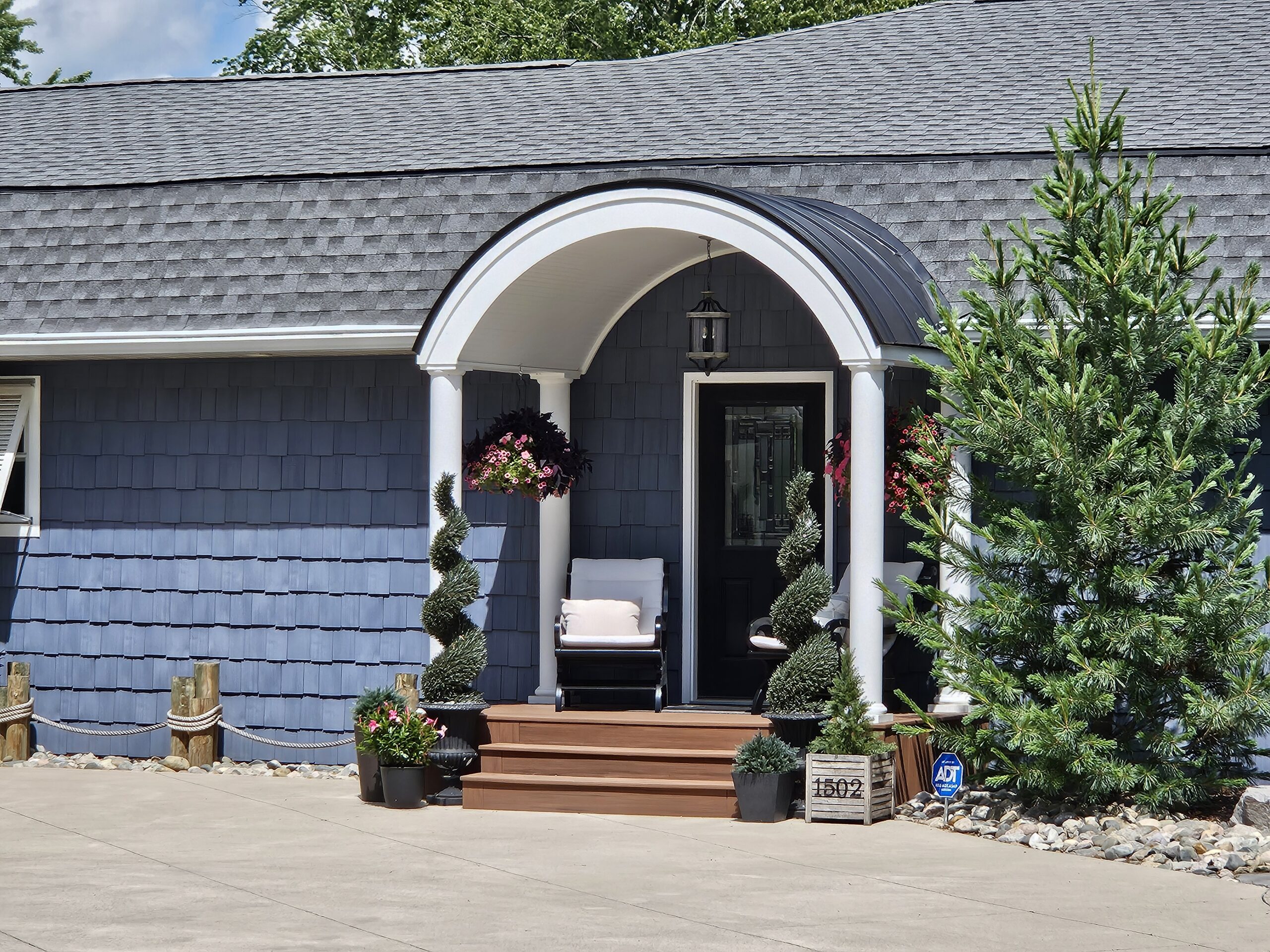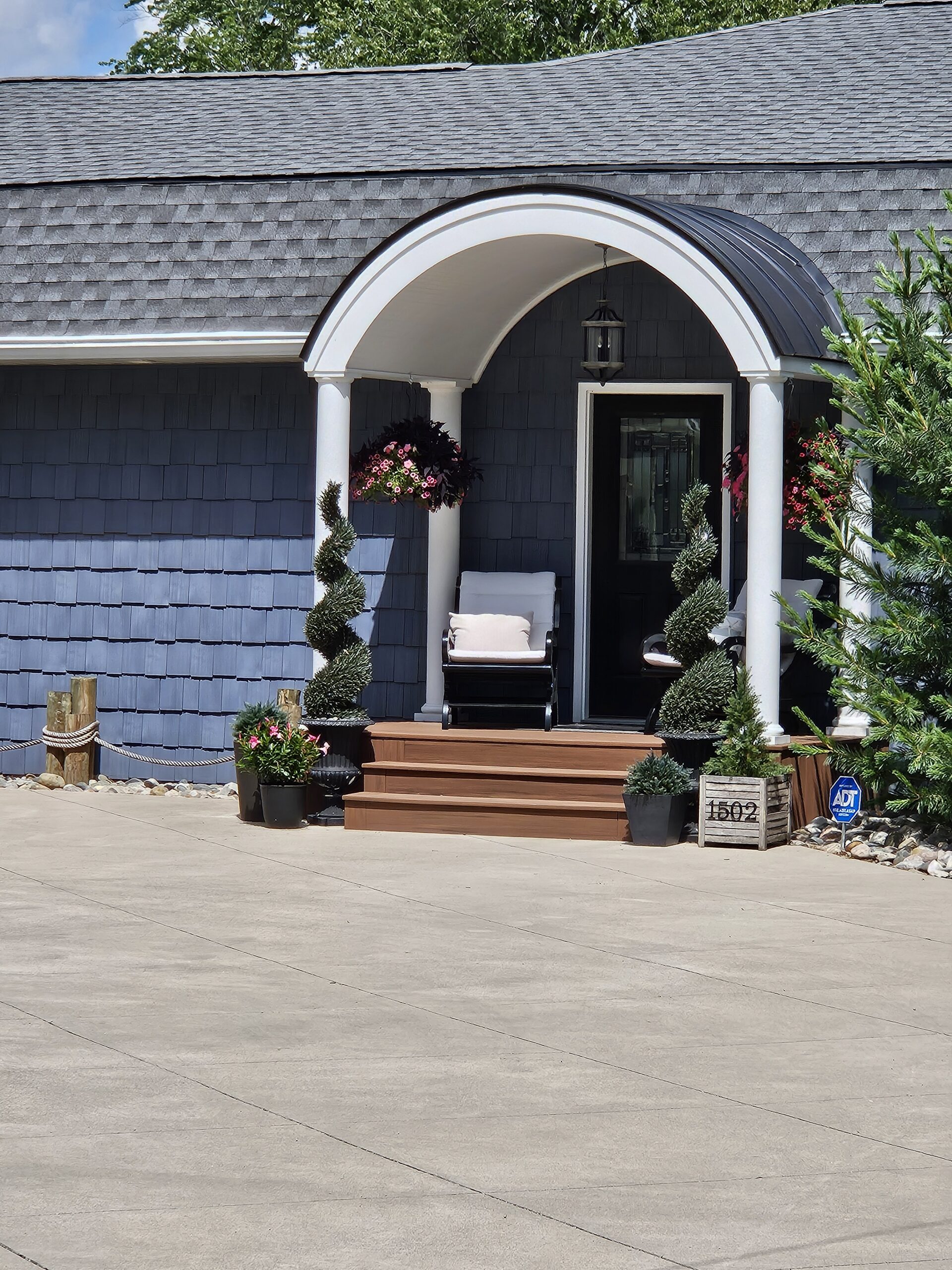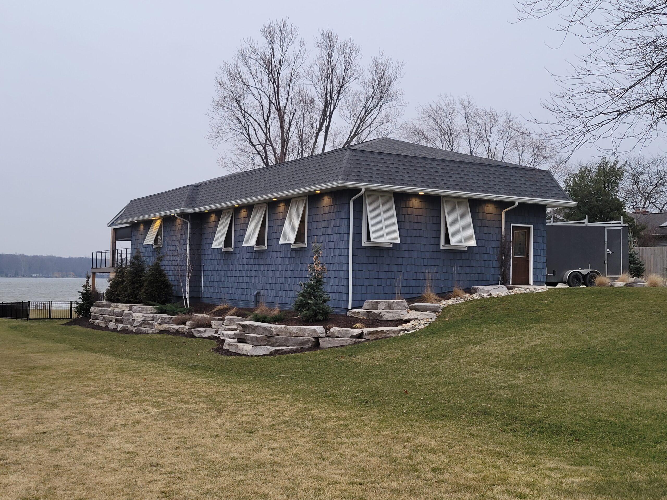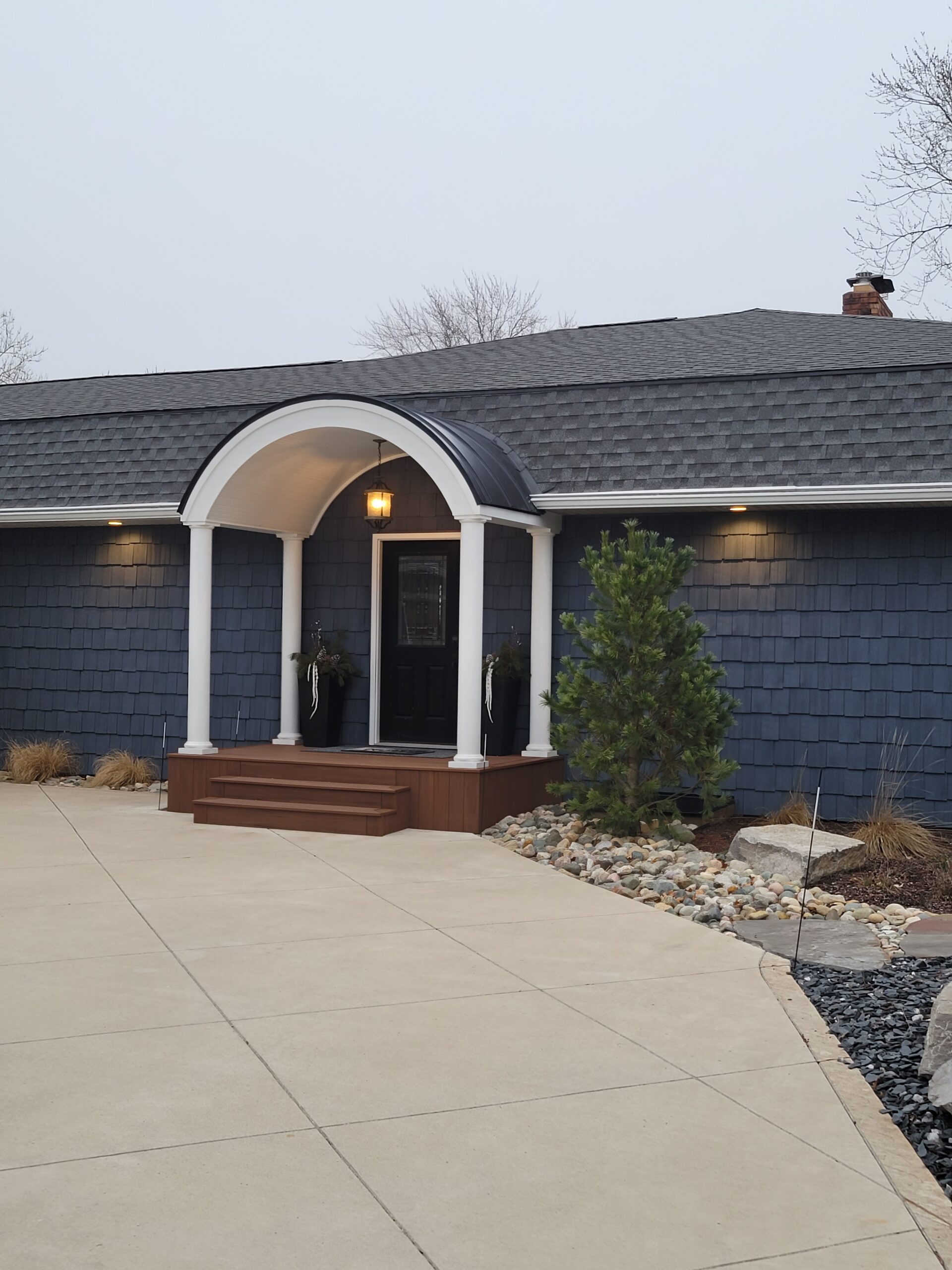 We did an extreme makeover on the exterior of this lake house. Shake siding all around. Built new larger decks, Built privacy walls with rough sawn cedar. Installed retractable screen on upper deck to keep out bugs in the evening. We provided an outdoor shower for the clients to clean up when they came out of the lake. We built a custom round roof over the new front porch area and installed custom bent standing seam steel roofing.