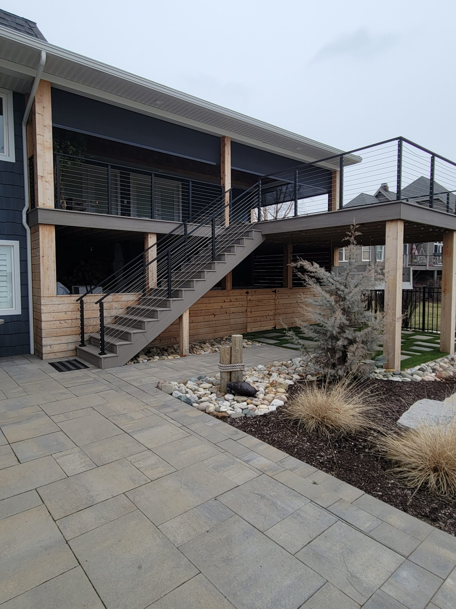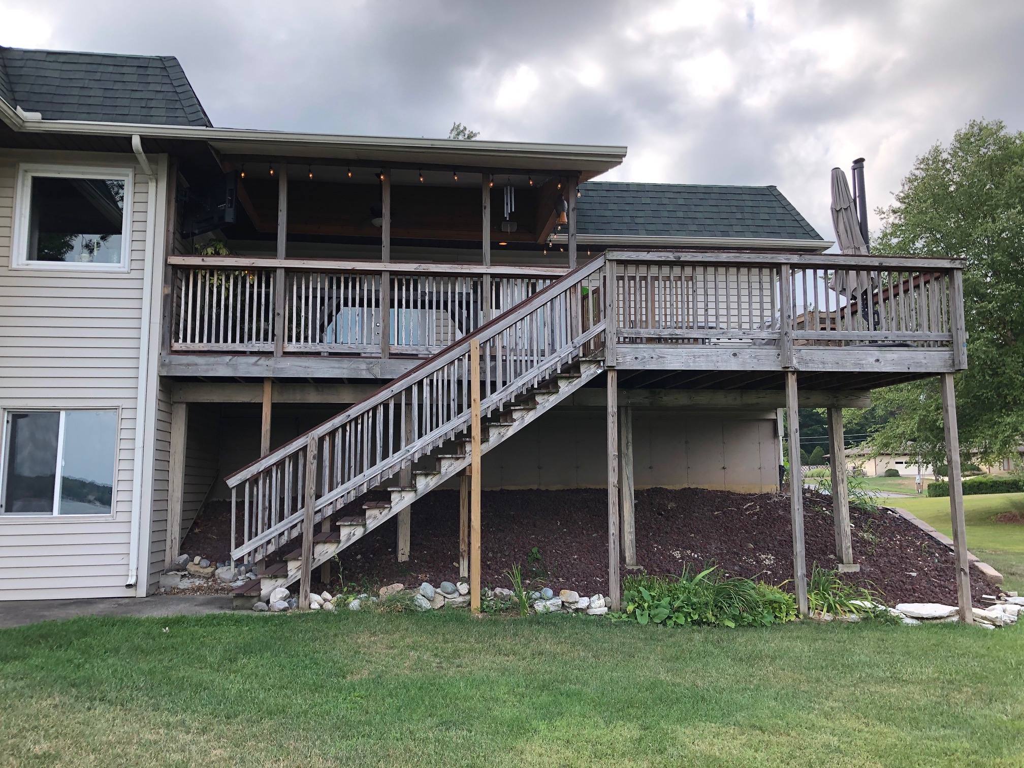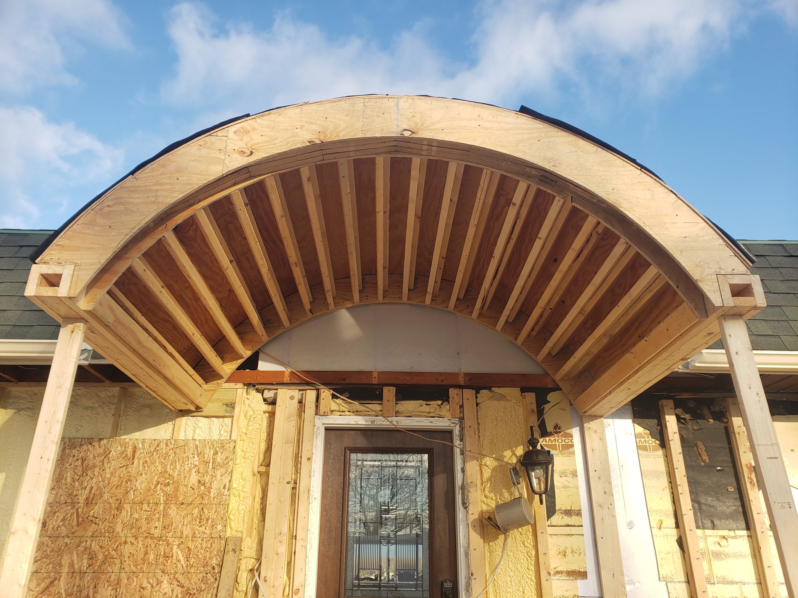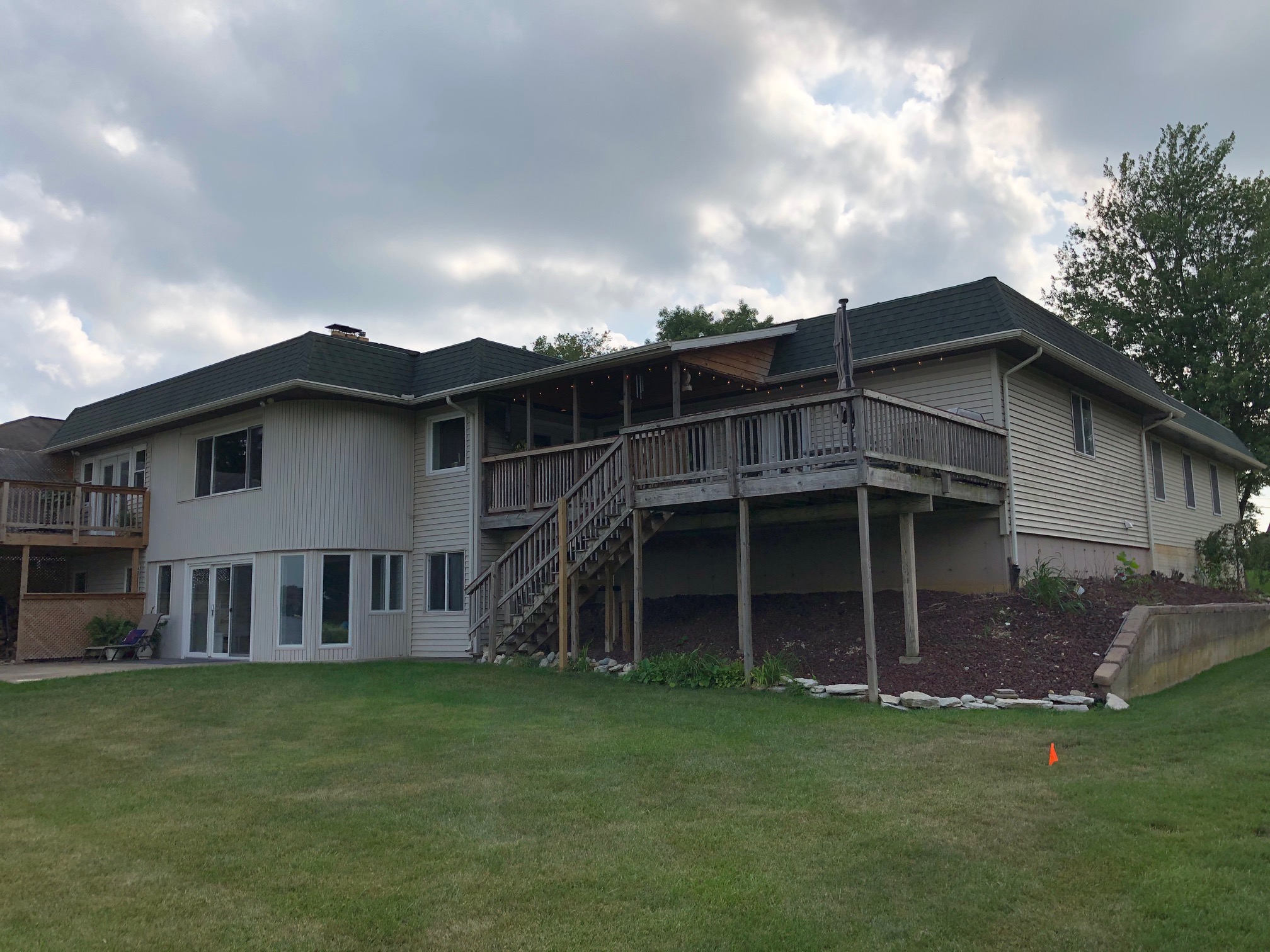 We did an extreme makeover on the exterior of this lake house. Shake siding all around. Built new larger decks, Built privacy walls with rough sawn cedar. Installed retractable screen on upper deck to keep out bugs in the evening. We provided an outdoor shower for the clients to clean up when they came out of the lake. We built a custom round roof over the new front porch area and installed custom bent standing seam steel roofing.