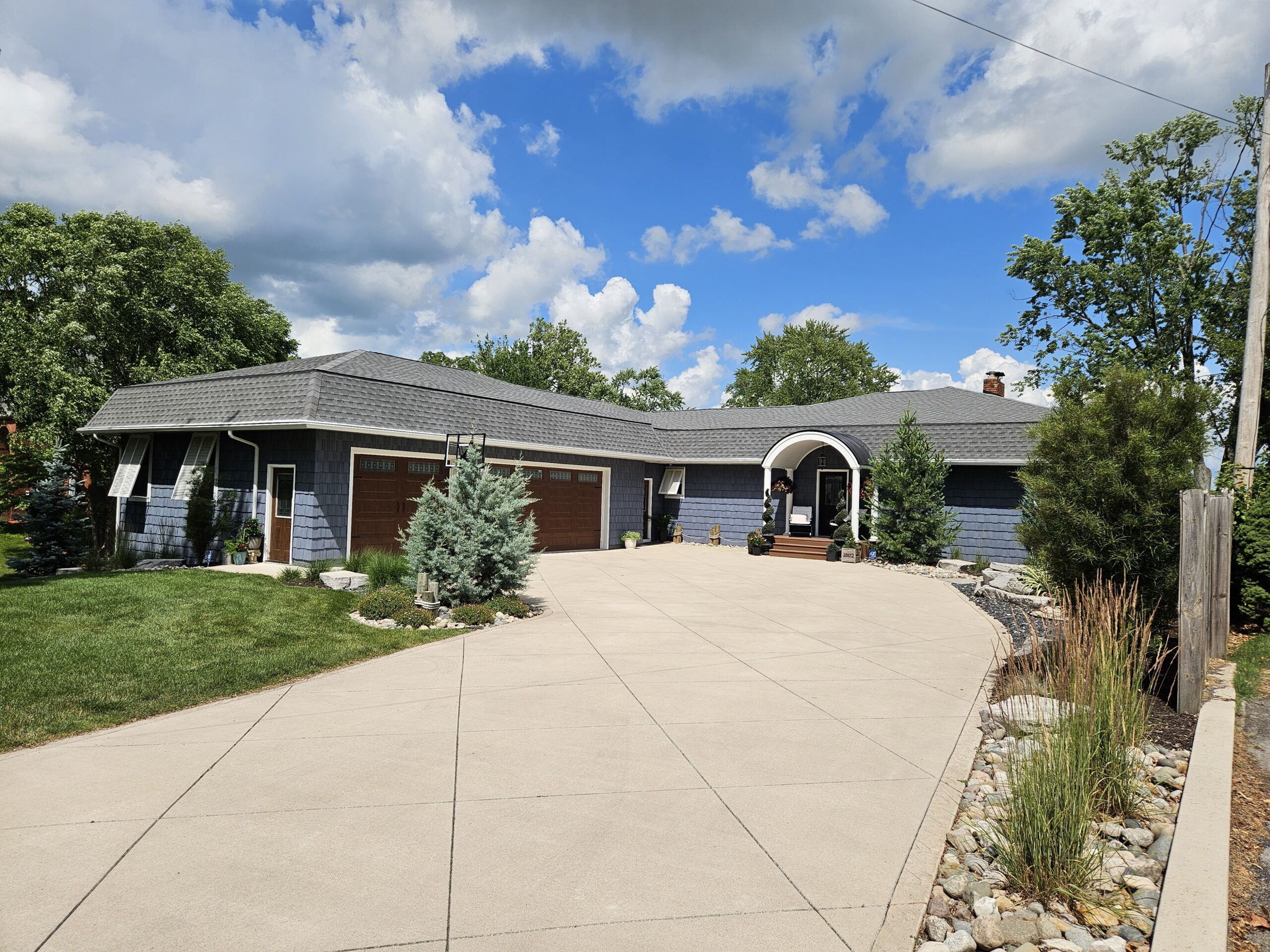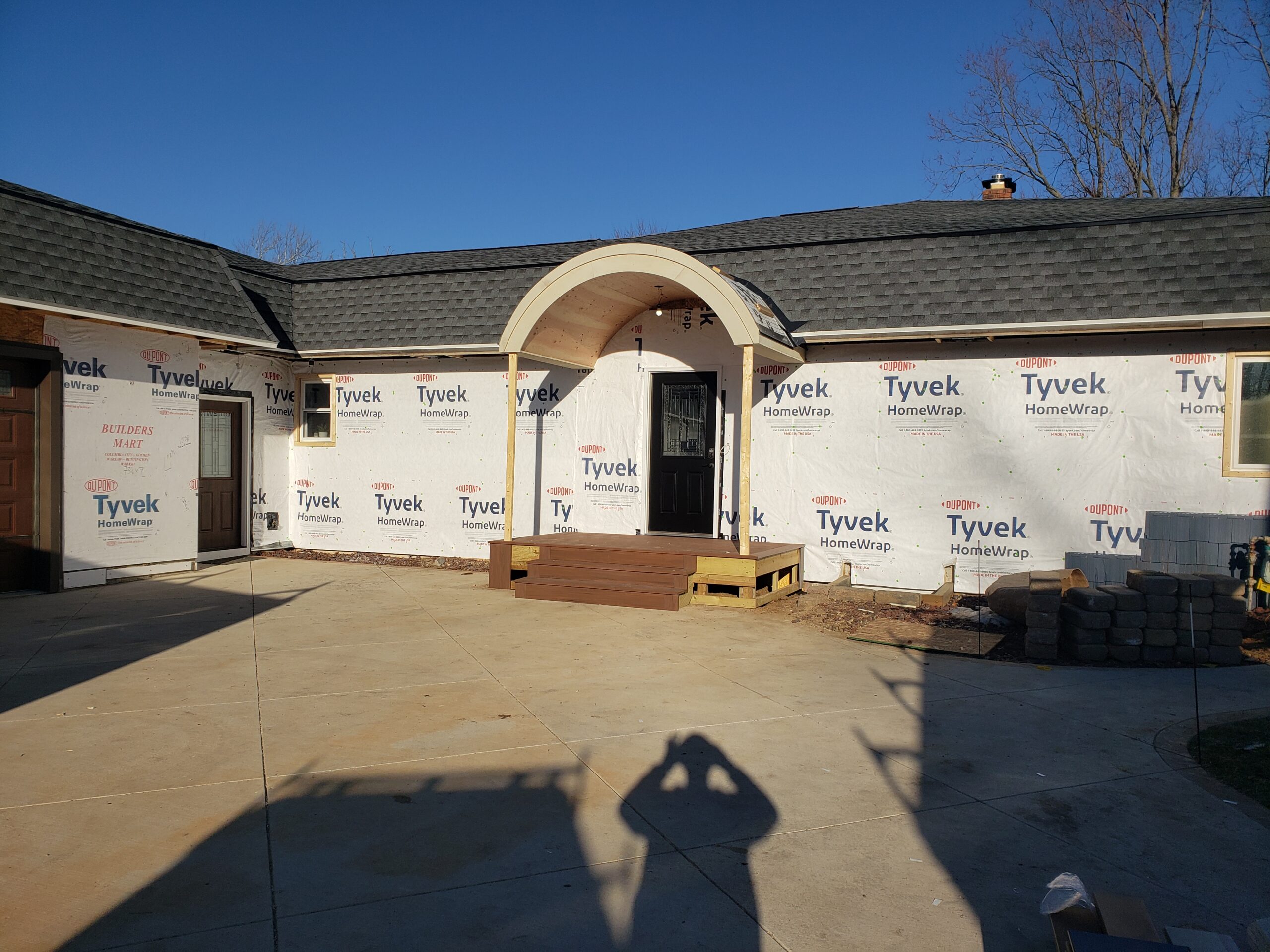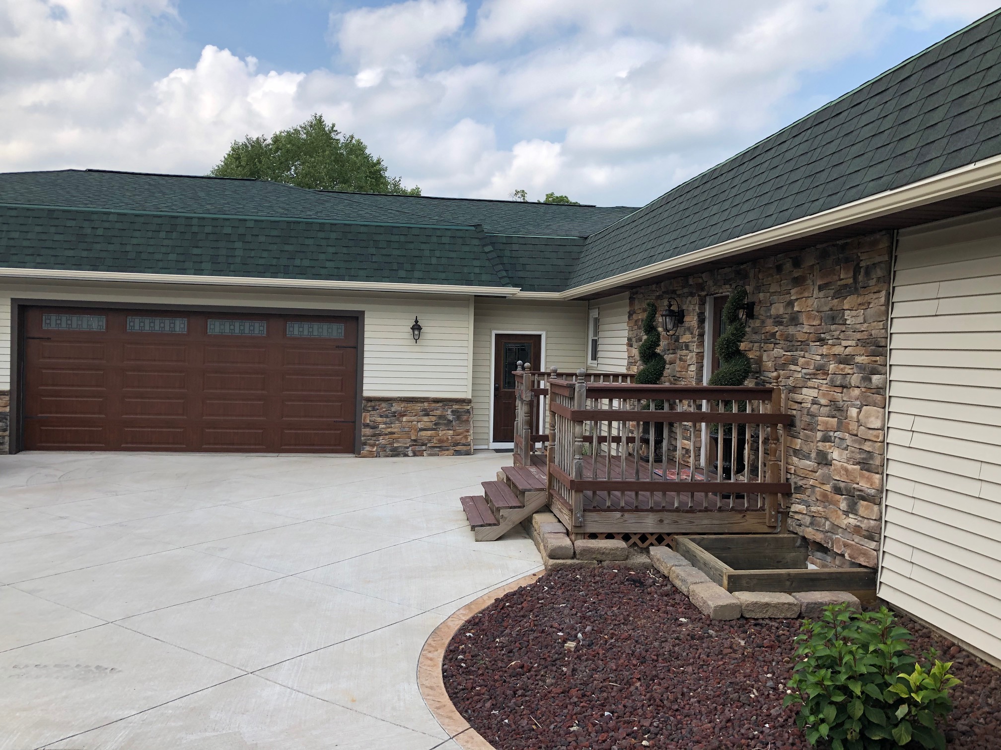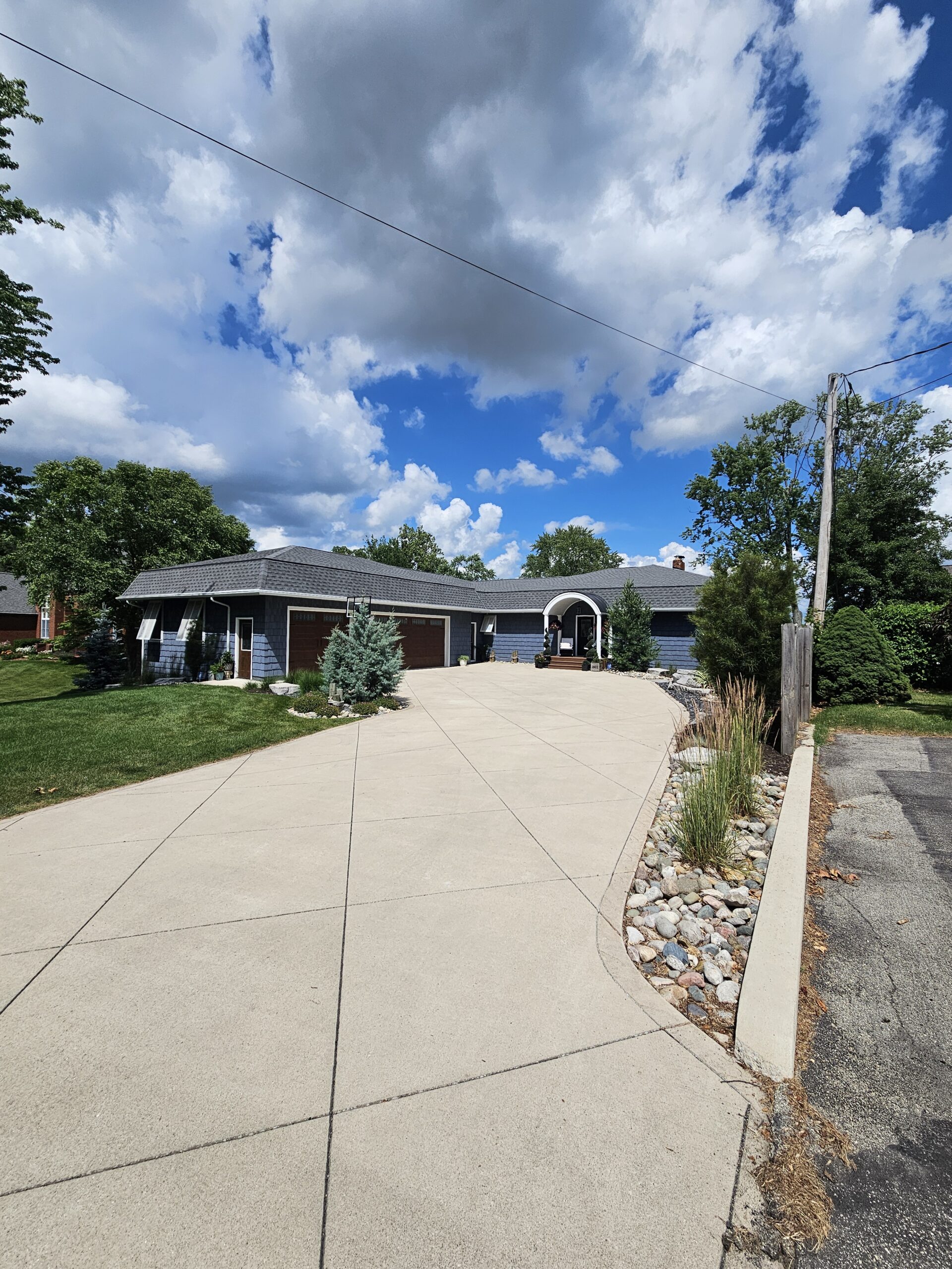 We did an extreme makeover on the exterior of this lake house. Shake siding all around. Built new larger decks, Built privacy walls with rough sawn cedar. Installed retractable screen on upper deck to keep out bugs in the evening. We provided an outdoor shower for the clients to clean up when they came out of the lake. We built a custom round roof over the new front porch area and installed custom bent standing seam steel roofing.
